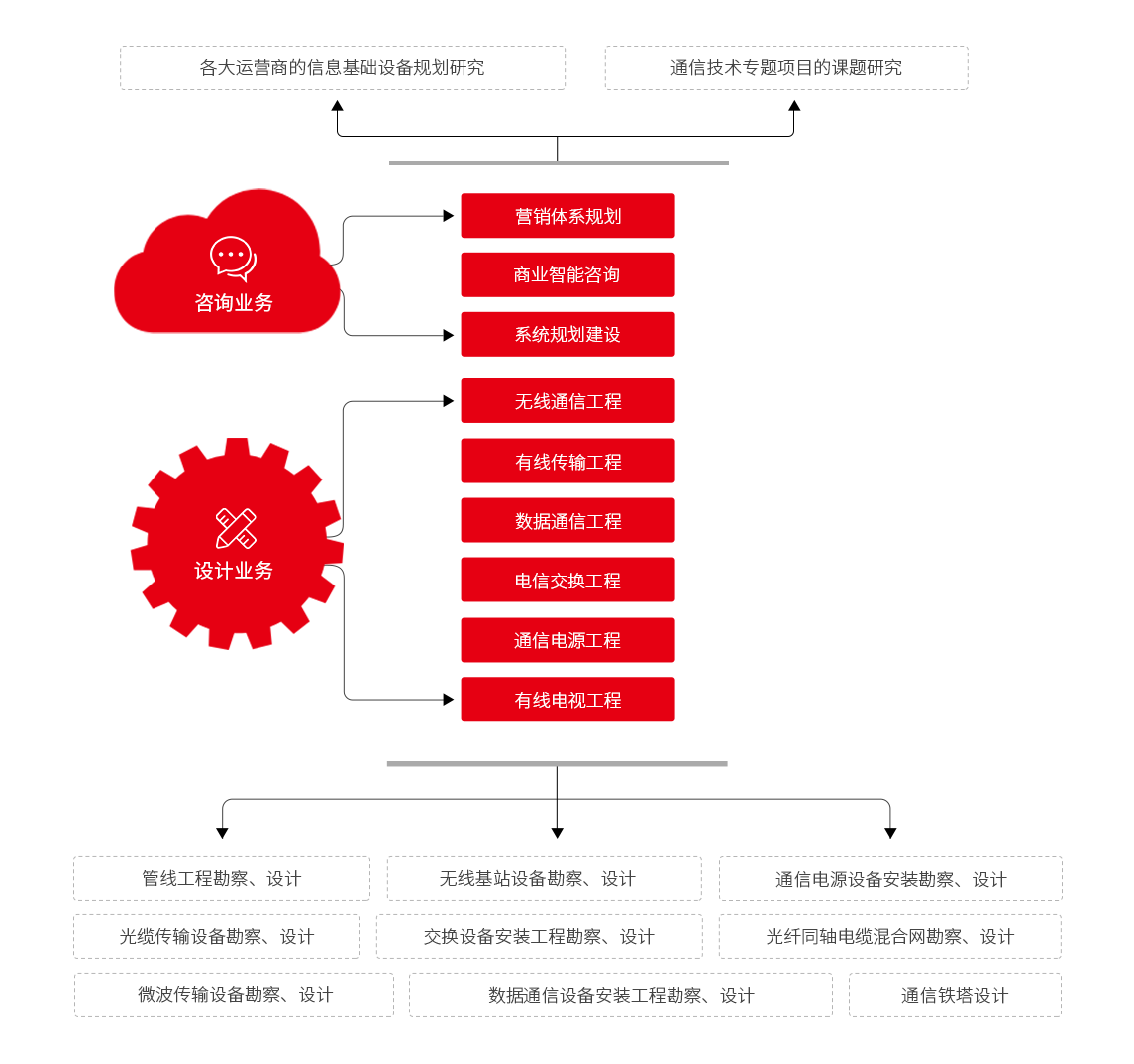 為客戶提供通信網(wǎng)、計算機網(wǎng)、廣播電視網(wǎng)等網(wǎng)絡的設計咨詢服務;為通信企業(yè)提供綜合發(fā)展規(guī)劃、戰(zhàn)略規(guī)劃 專題規(guī)劃、業(yè)務咨詢及管理咨詢等咨詢服務。公司擁有工程設計、工程勘察等國內(nèi)通信設計領域的頂級資質(zhì);優(yōu)質(zhì)的服務質(zhì)量,快速的業(yè)務響應能力、標準化、規(guī)范化的服務流程以及優(yōu)秀的工程設計項目質(zhì)量為公司在業(yè)界取得良好的口碑。